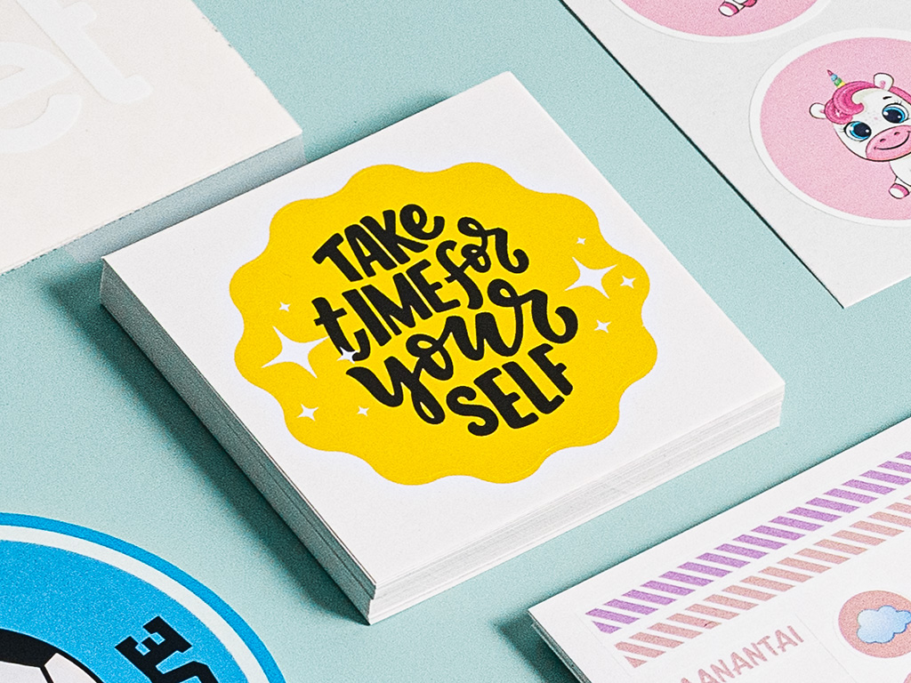 Suorakulmaiset tarrat leikattuina yksittäiskappaleiksi tai asemoituina arkille, josta ne saa helposti irti.